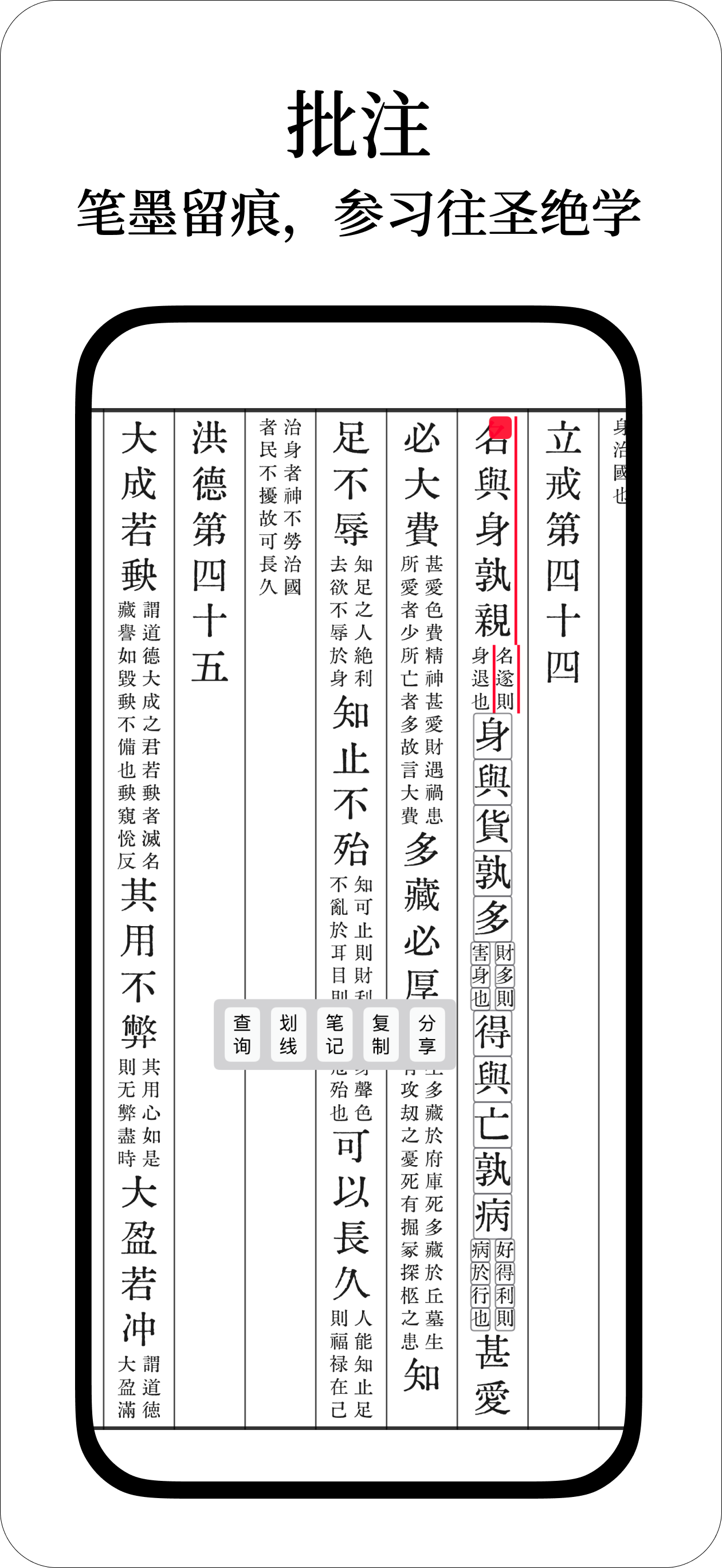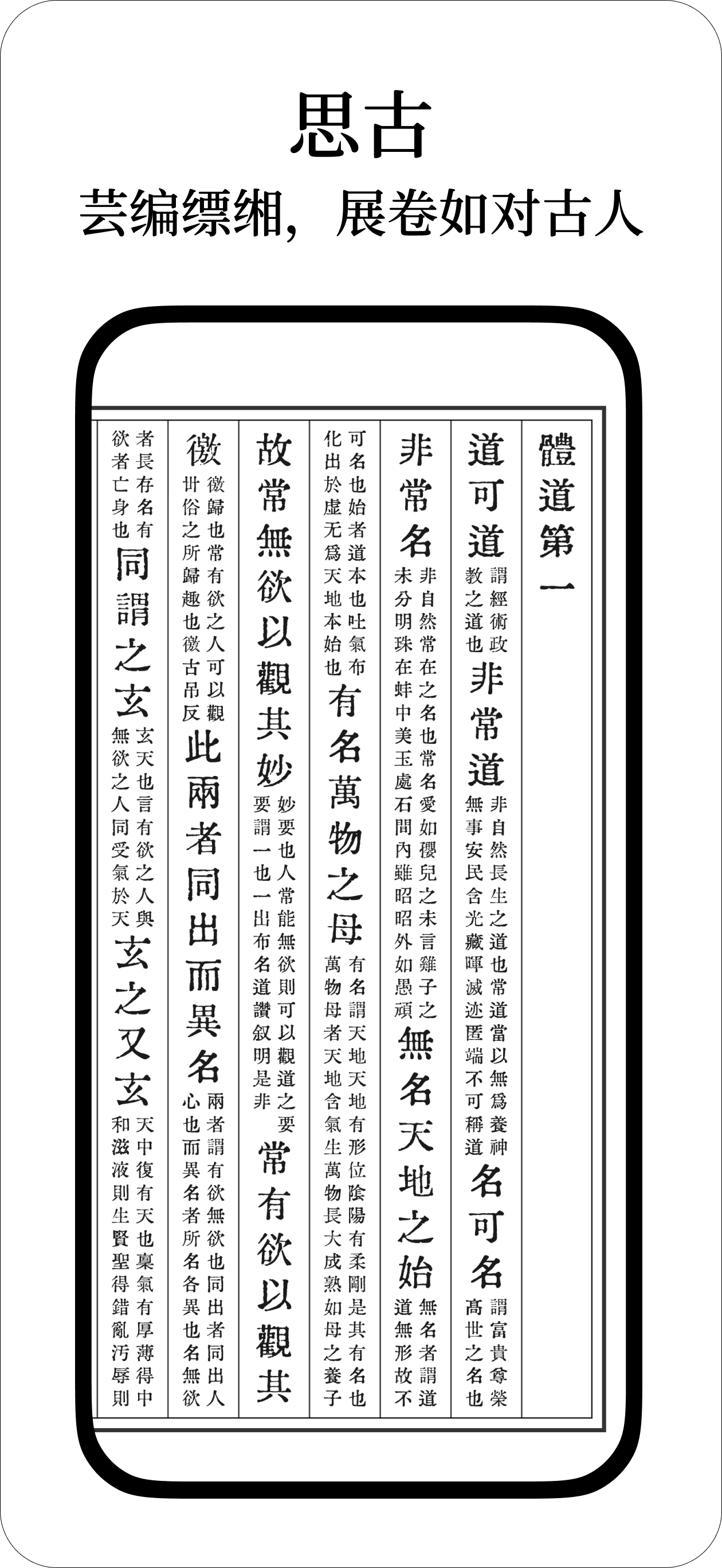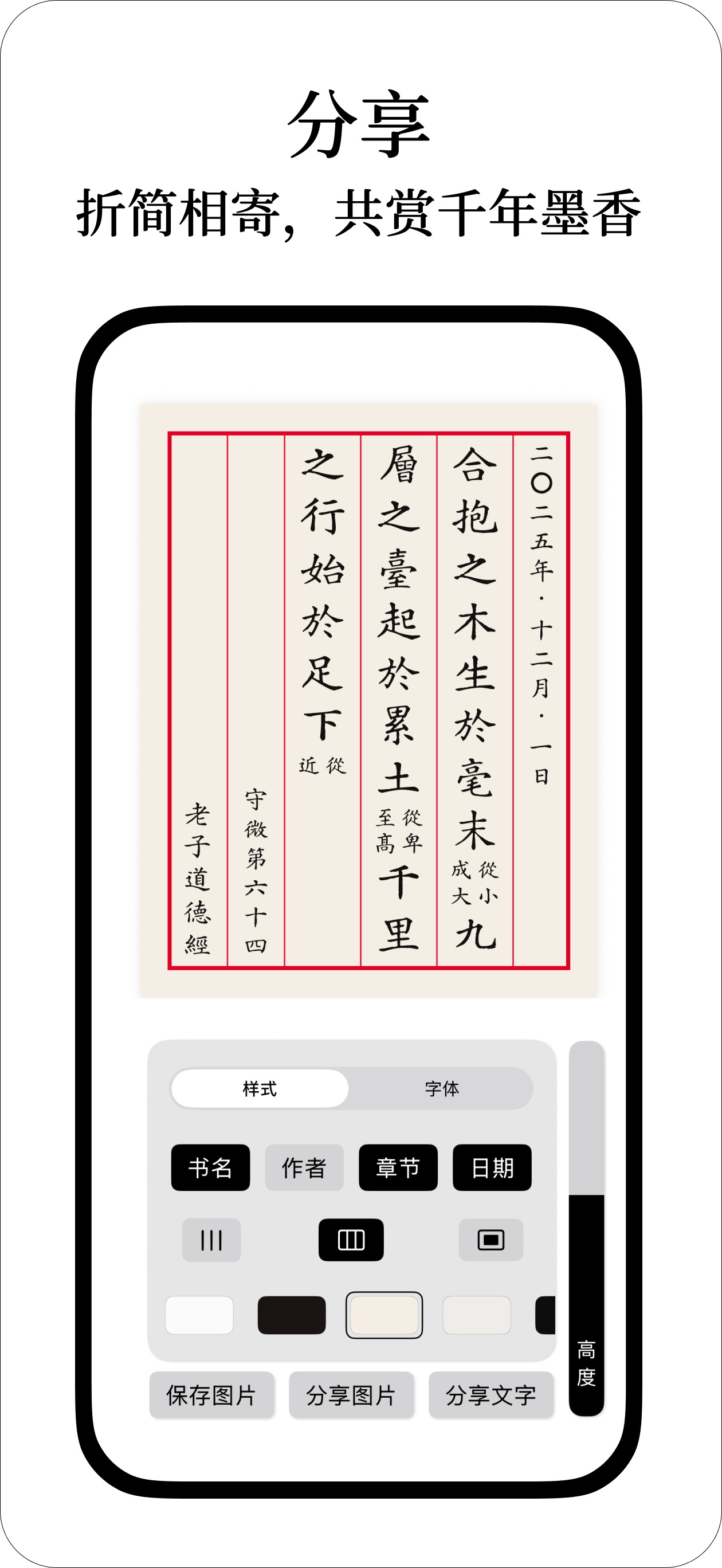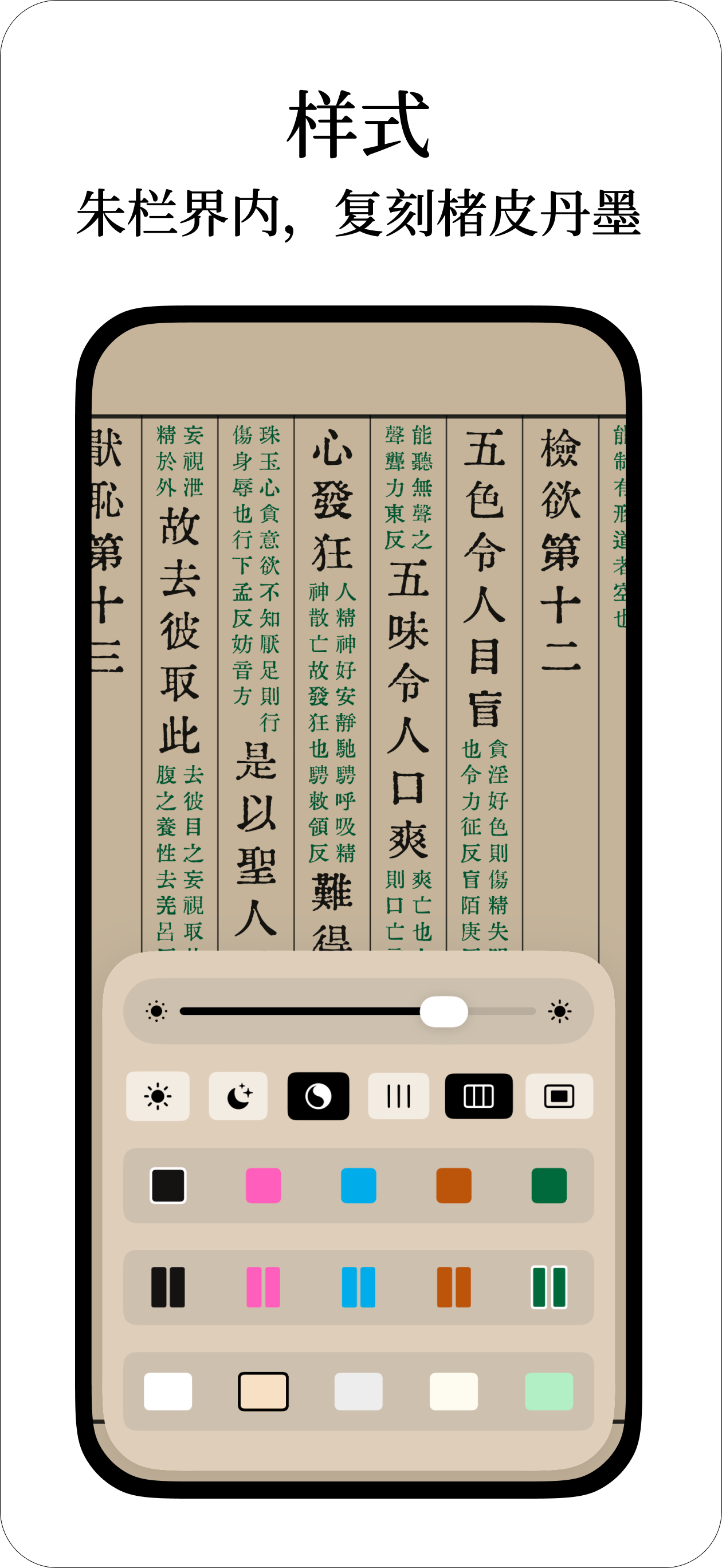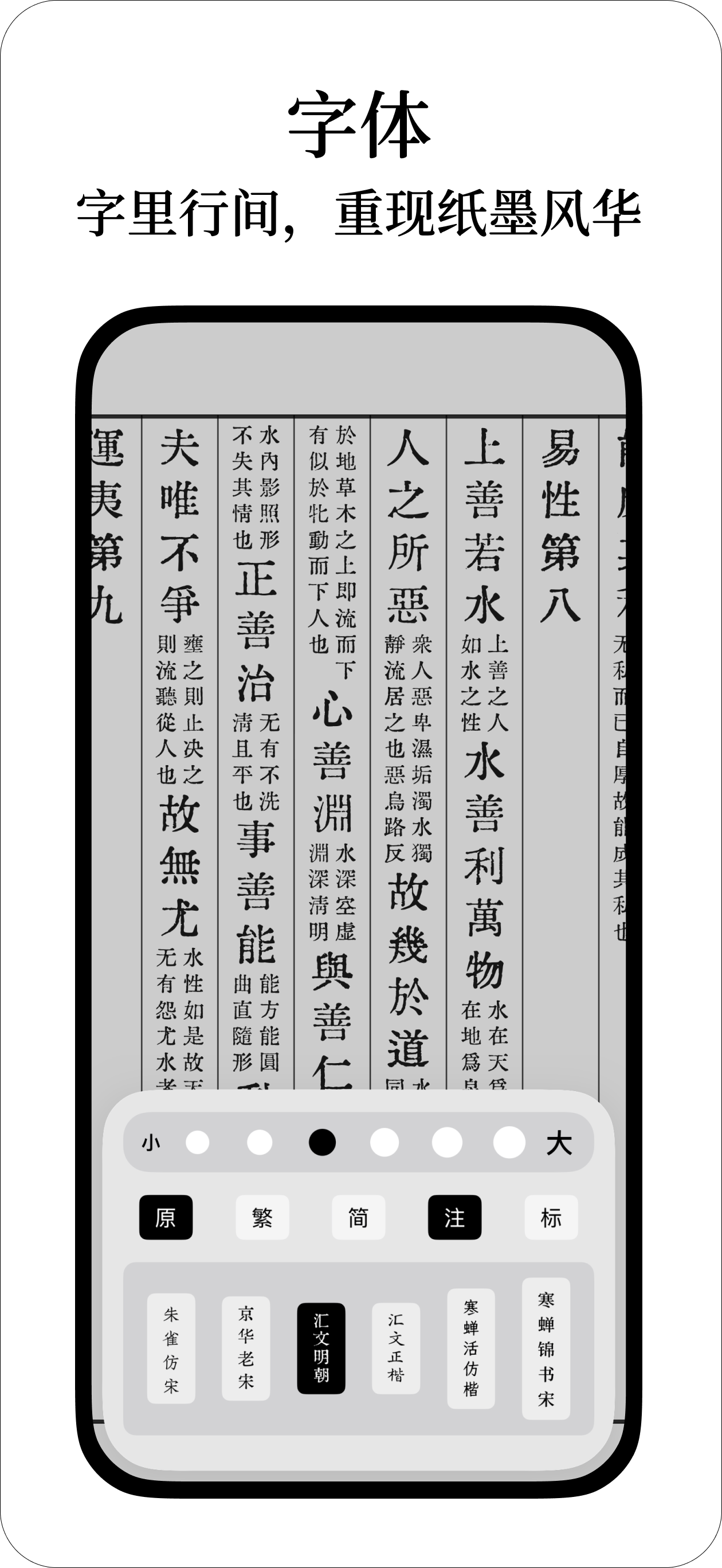 多种字体、背景色,文字颜色、版式可选;支持字体大小调节,原繁简切换,标点显隐,注疏显隐;